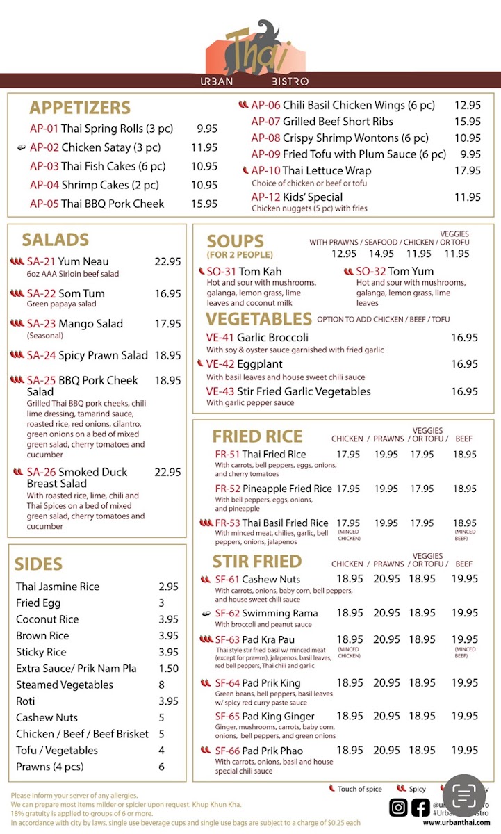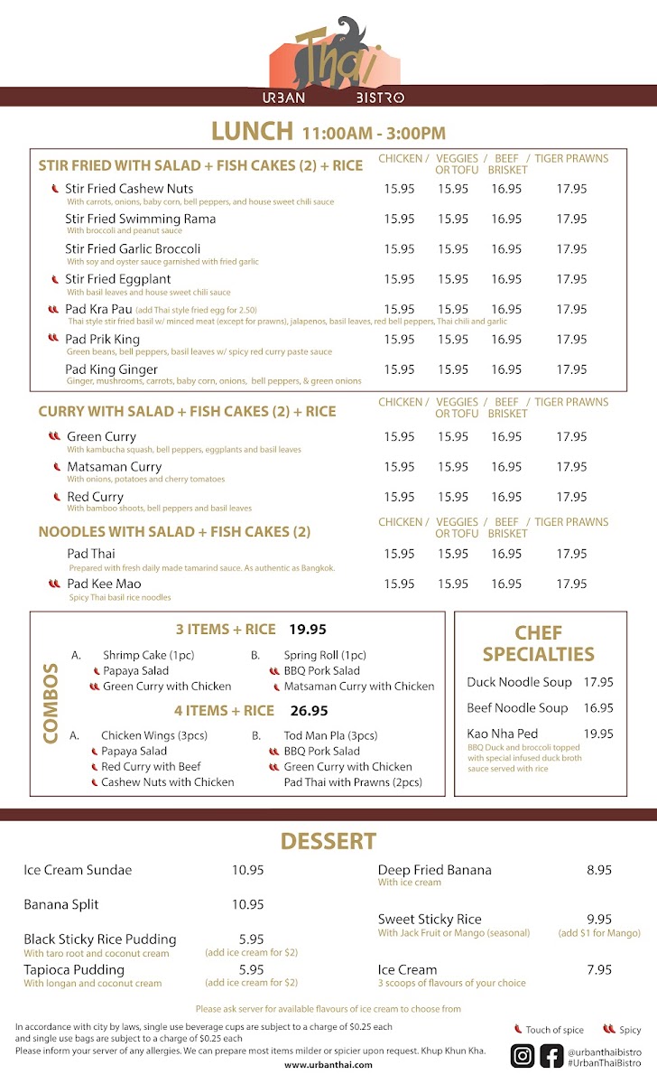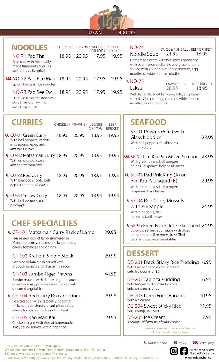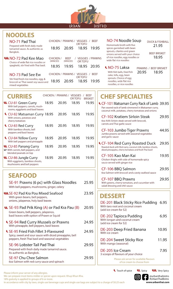 The menu at Urban Thai Bistro offers a variety of traditional Thai dishes along with some Malaysian influences. It includes categories such as appetizers, noodle and rice dishes, soups, curries, and desserts. Popular selections include Pad Thai, Laksa Noodle Soup, Chicken Satay, and Thai Fried Rice, highlighted by a balance of mild to moderately spiced options.