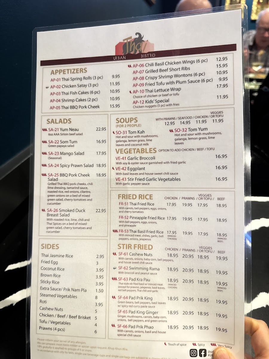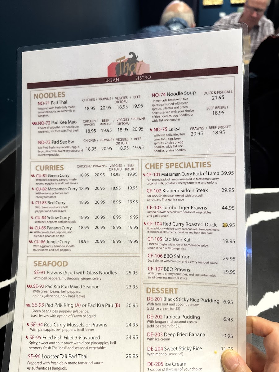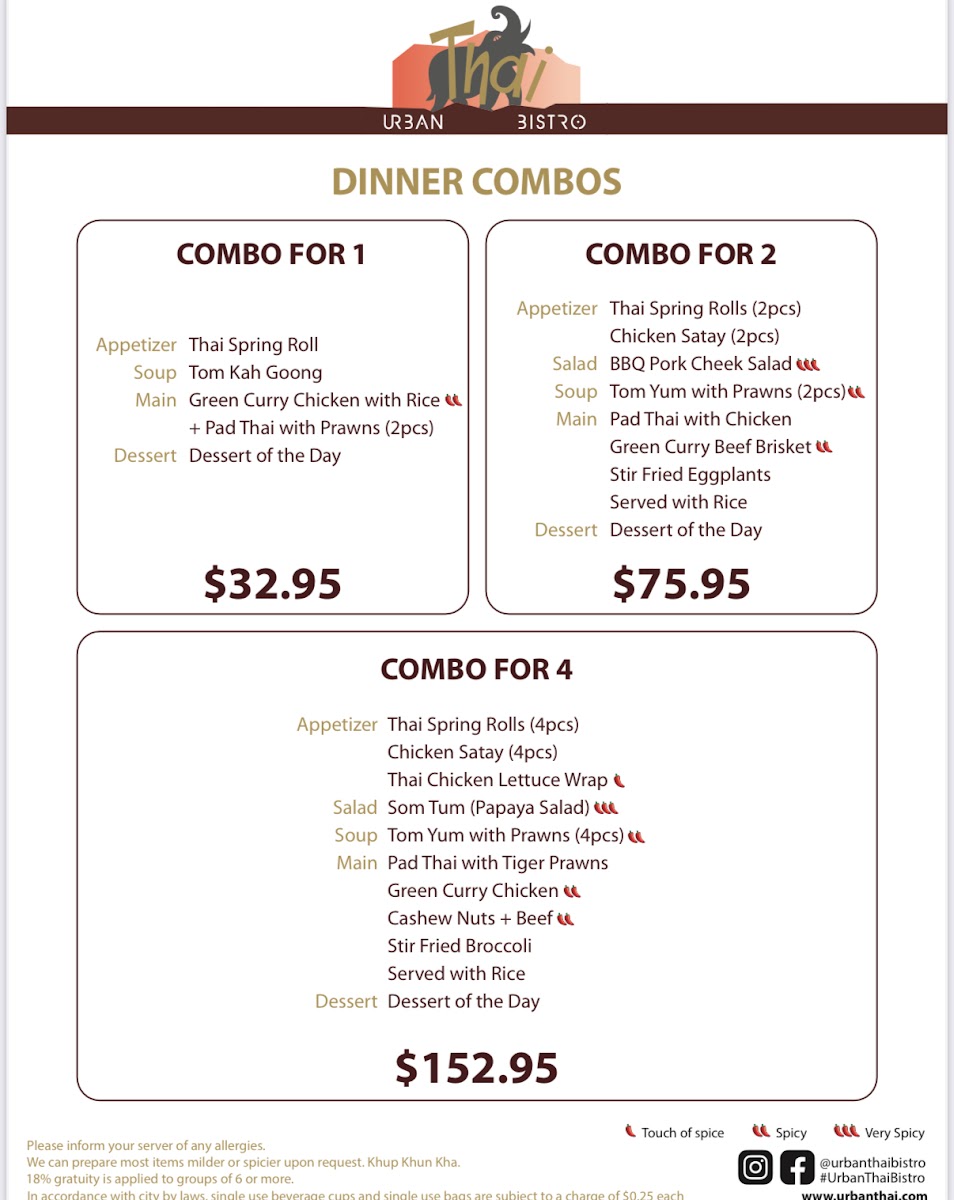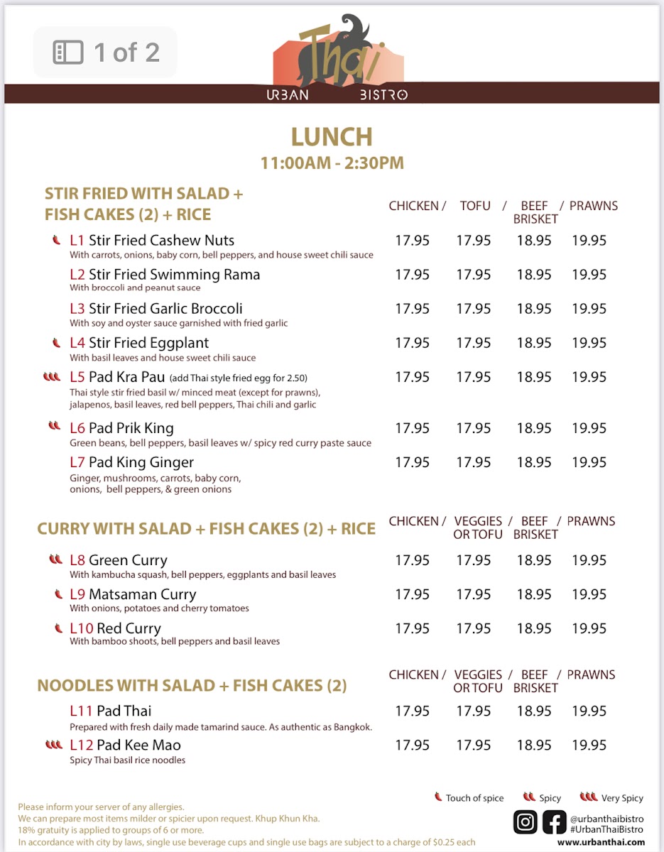 The menu at Urban Thai Bistro offers a variety of traditional Thai dishes along with some Malaysian influences. It includes categories such as appetizers, noodle and rice dishes, soups, curries, and desserts. Popular selections include Pad Thai, Laksa Noodle Soup, Chicken Satay, and Thai Fried Rice, highlighted by a balance of mild to moderately spiced options.